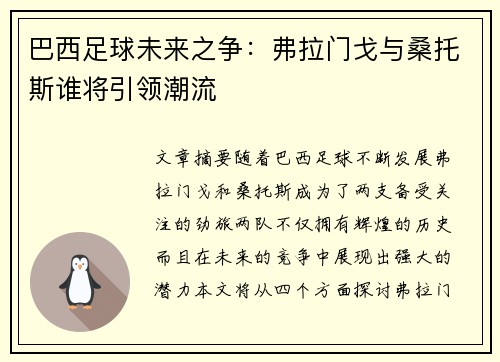 随着巴西足球不断发展,弗拉门戈和桑托斯成为了两支备受关注的劲旅。两队不仅拥有辉煌的历史,而且在未来的竞争中展现出强大的潜力。本文将从四个方面探讨弗拉门戈与桑托斯的未来竞争:球队历史与文化背景、青训体系与球员发展、战术创新与教练发展、市场与商业运作。通过对比分析,我们将揭示未来谁将更有可能引领巴西足球潮流。亮点包括:弗拉门戈在国际赛场的崛起、桑托斯青训培养新星的潜力,以及两队如何通过战术革新应对全球足球发展趋势。